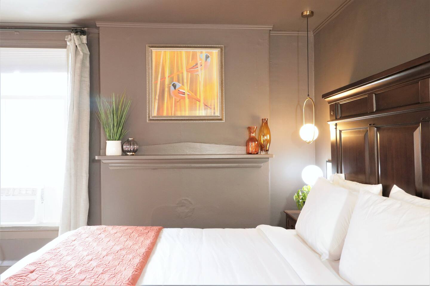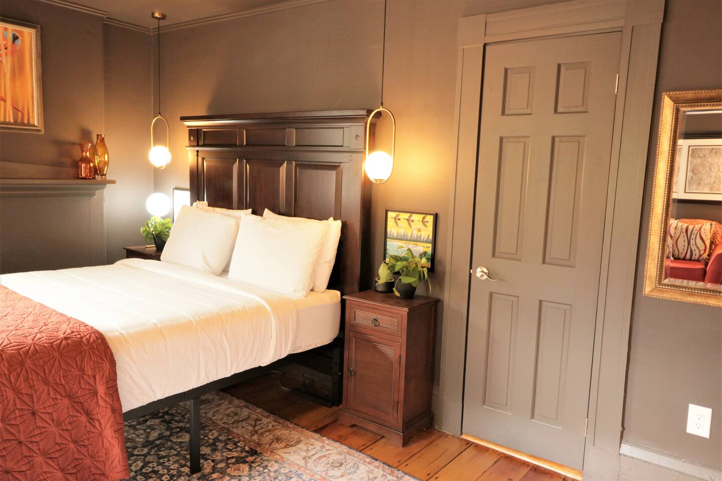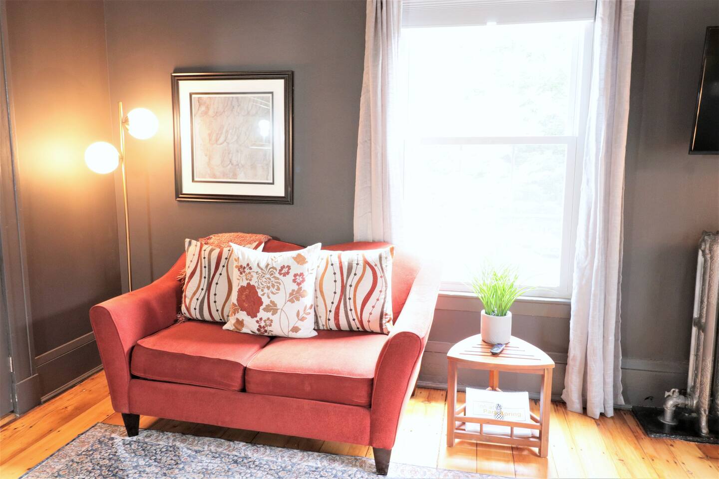 Location, Location, Location! Welcome to The Inn at Park Spring! Formerly the Park Spring Bed & Breakfast, we recently dropped the breakfast to serve Airbnb guests near and far as a boutique hotel. ROOM 3: This moody room is offset by the ample sunlight that shines through the windows overlooking both Park and Spring Streets. A queen bed, small sofa, marble bathroom, and plants complete the room. One off street parking spot is included with the room, just one block away.