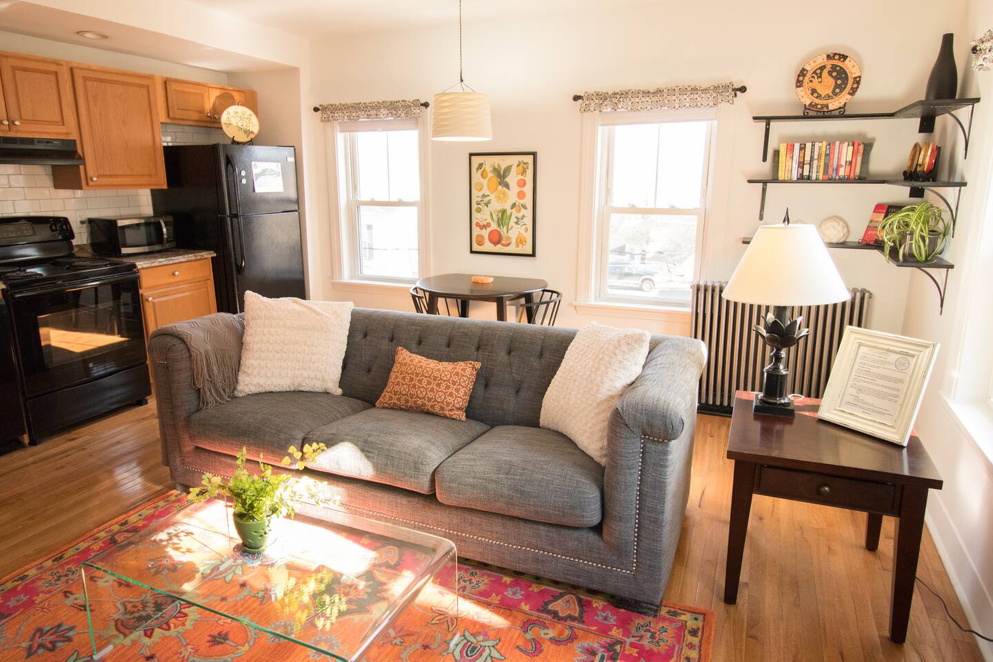 Located just a couple blocks from Maine Medical Center and the Western Promenade, this private one-bedroom apartment, located on the second floor, is walking distance to the Arts District, Deering Oaks Park, and numerous restaurants, stores, and coffee shops. Views of Back Bay can be seen from the living room from November through April. Parking available for compact cars only. Fresh towels, linens, toilet paper, paper towels and basic kitchen items (pots and pans, plates, glassware, mugs, cutlery). Please be prepared to supply your own food (including spices/oil), drinks (including coffee/tea), personal products and other items that you might need to have a comfortable stay. With Portland's sought after food scene, we have found that most guests opt to dine out rather than cook in the apartment. For that reason we keep the kitchen extremely bare boned in order to cut down on unused items. A Smart TV is provided should guests have their own streaming services. *no cable or streaming service is provided by the host* The bedroom has air conditioning during the warmer months. STHR‐001993‐2019