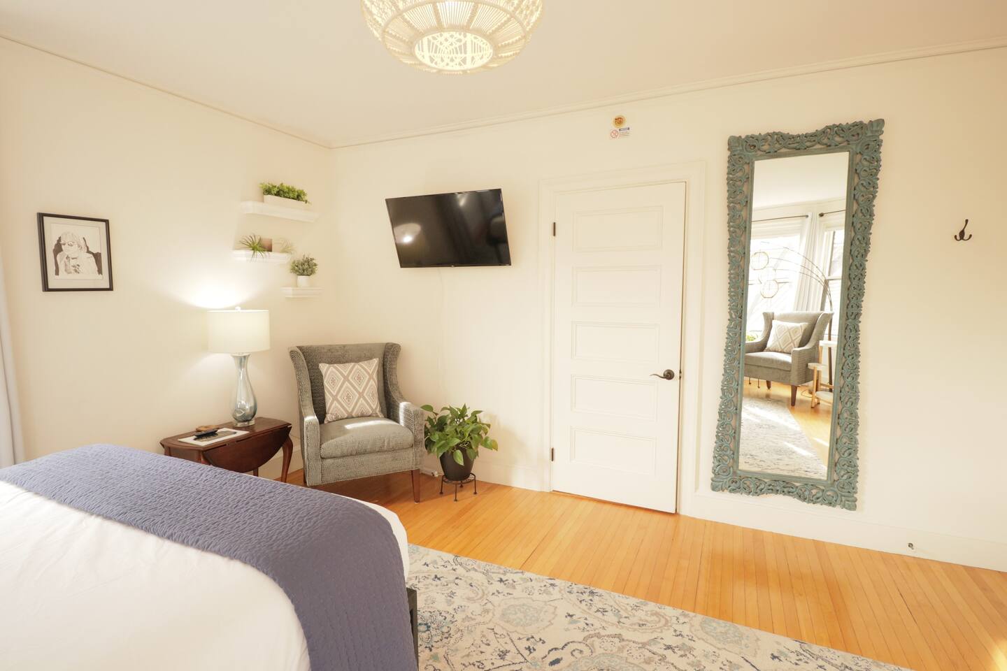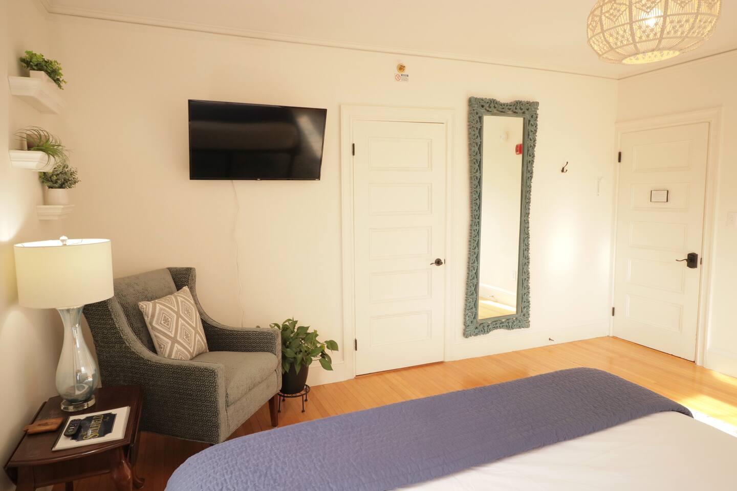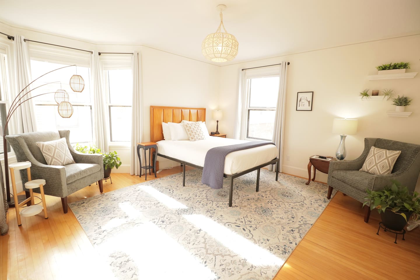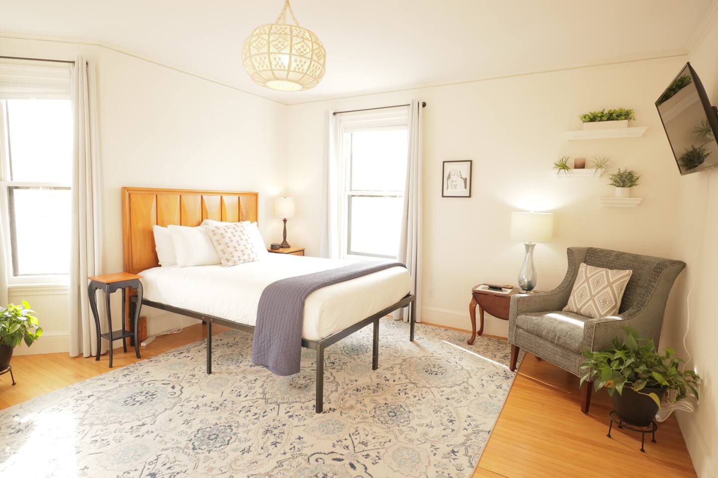 Welcome to The Skolfield Inn! ROOM 3: Overlooking the gardens, this room sits in the back of the home and gets great afternoon light. Relax on the chairs or watch the sun set from your bed, this spacious room fits all your needs. One off street parking spot is provided for compact/small vehicles.