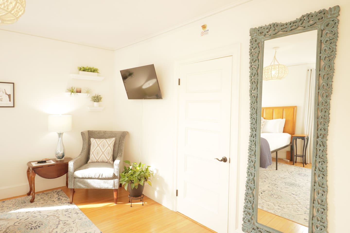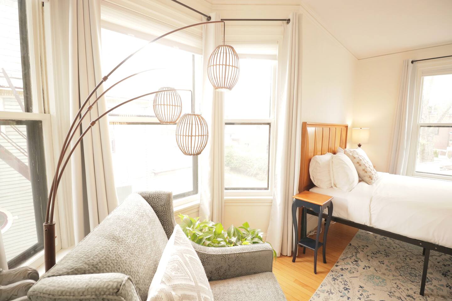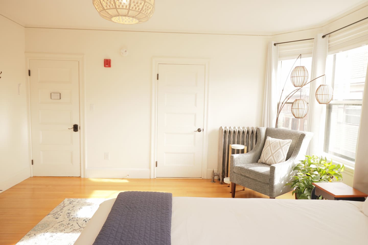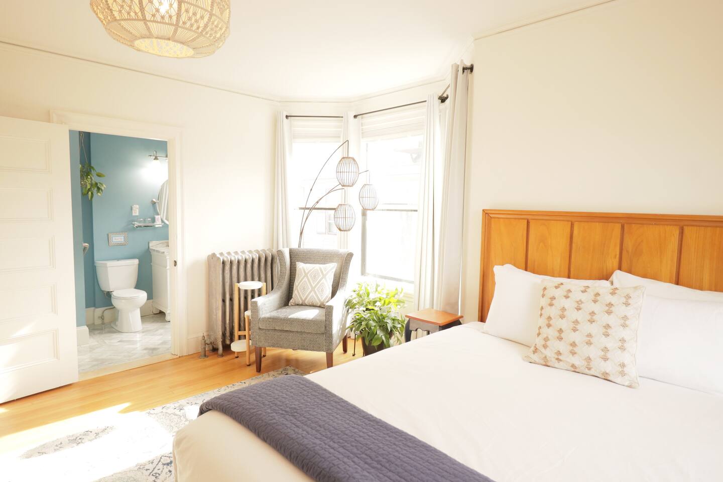 Welcome to The Skolfield Inn! ROOM 3: Overlooking the gardens, this room sits in the back of the home and gets great afternoon light. Relax on the chairs or watch the sun set from your bed, this spacious room fits all your needs. One off street parking spot is provided for compact/small vehicles.