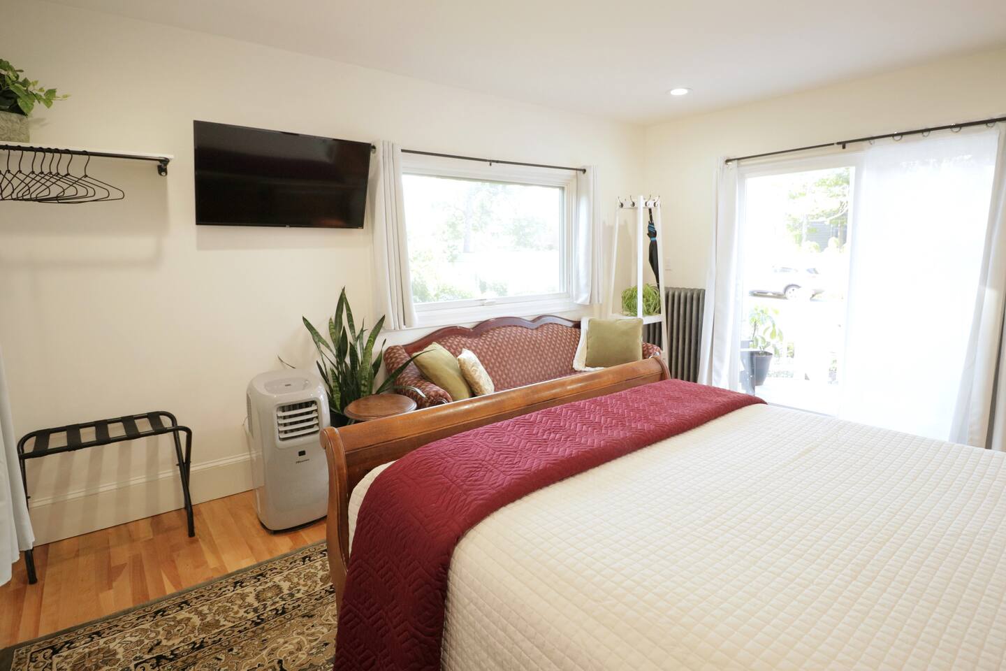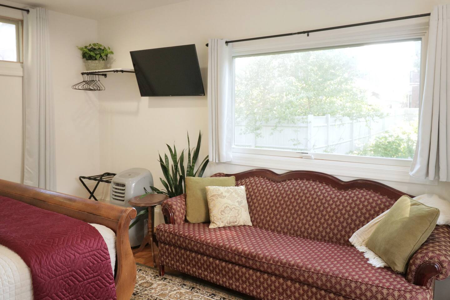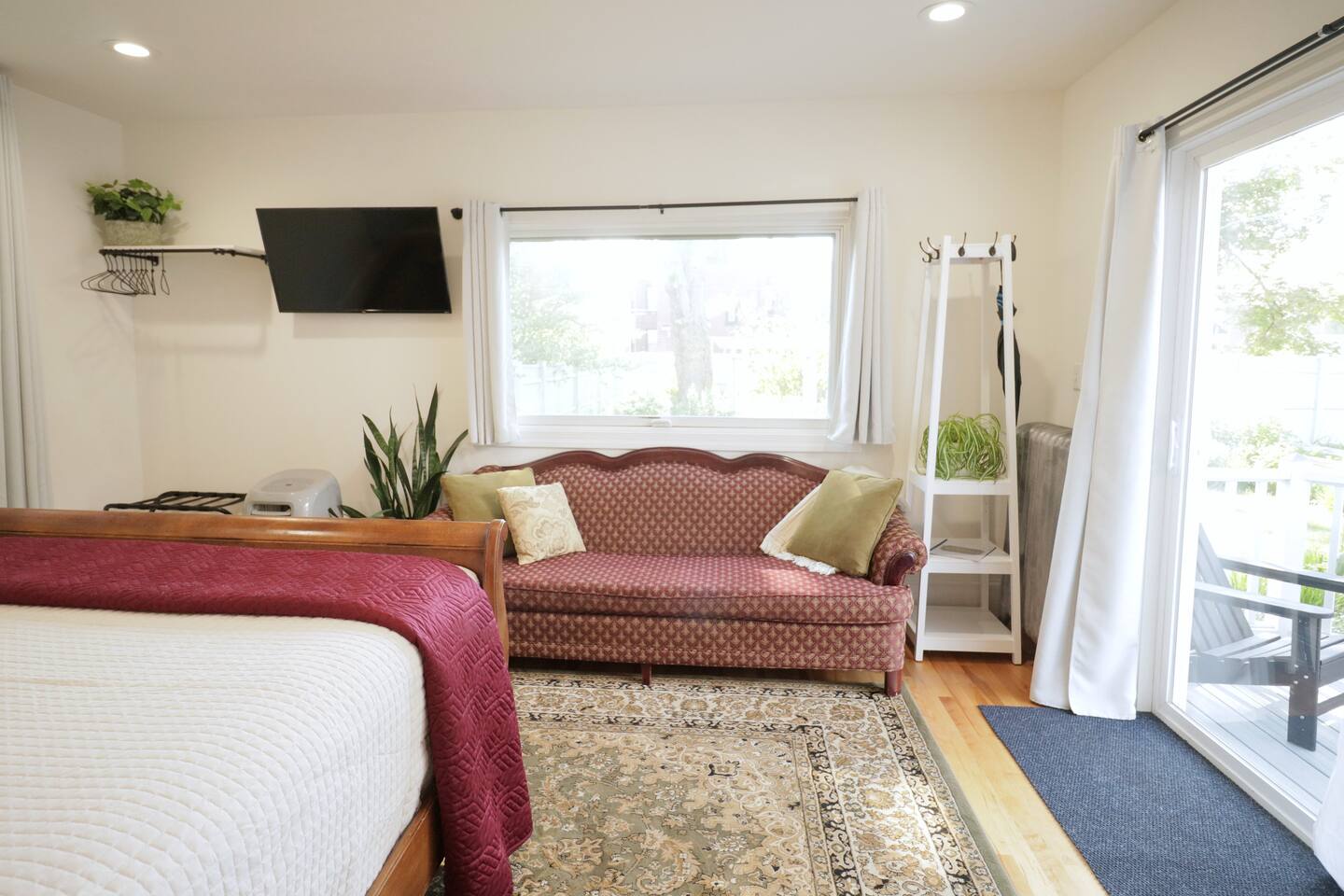 This room offers plenty of space. Relax on the couch with a book, bring your mat and squeeze in an early morning yoga session, or snuggle up in bed and watch Netflix while you contemplate the sunset from the over-sized picture window. This room is located in an inn licensed with the State of Maine. *No Off Street Parking* Parking within a half mile is hourly only 9a-5p M-F. Outside these hours & on weekends you can park on our street.